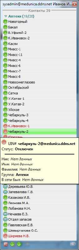 Не запускаются ли параллельно какие-либо ещё клиенты?Иногда возникает странная ситуация, на моем клиенте другой клиент показывается в оффлайне, на его клиенте он в онлайне, во вложение скриншоты. Мой (первая картинка) ник - Иванов И.В. , проблемный клиент (вторая картинка) Чебаркуль-2. И такая ситуация случается частенько и с разными юзерами