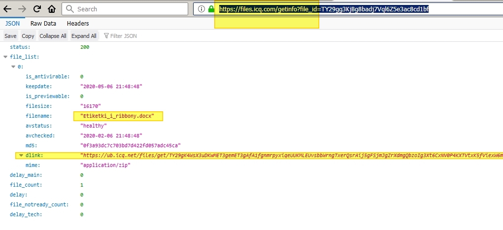 - Если у файла по ссылке на сервер ICQ есть превью изображение, то оно отображается в чате, а при открытии ссылки файл скачивается, для остальных открывается json
